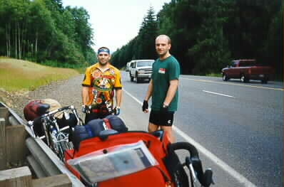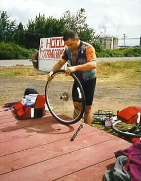 Marc got the first flat, a staple in the rear wheel. Stopped for a snack